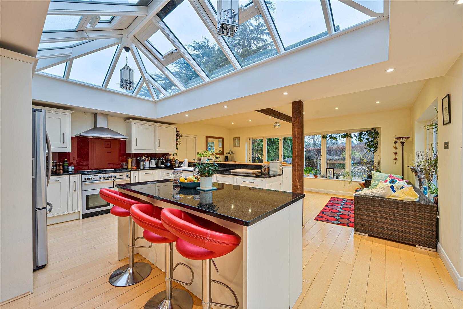 At the heart of the home is a central kitchen, open-plan to a bright dining/family area with bi-fold doors and a striking glass atrium—perfect for modern family living and entertaining.
