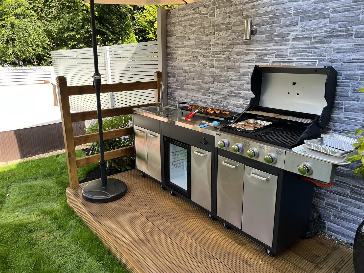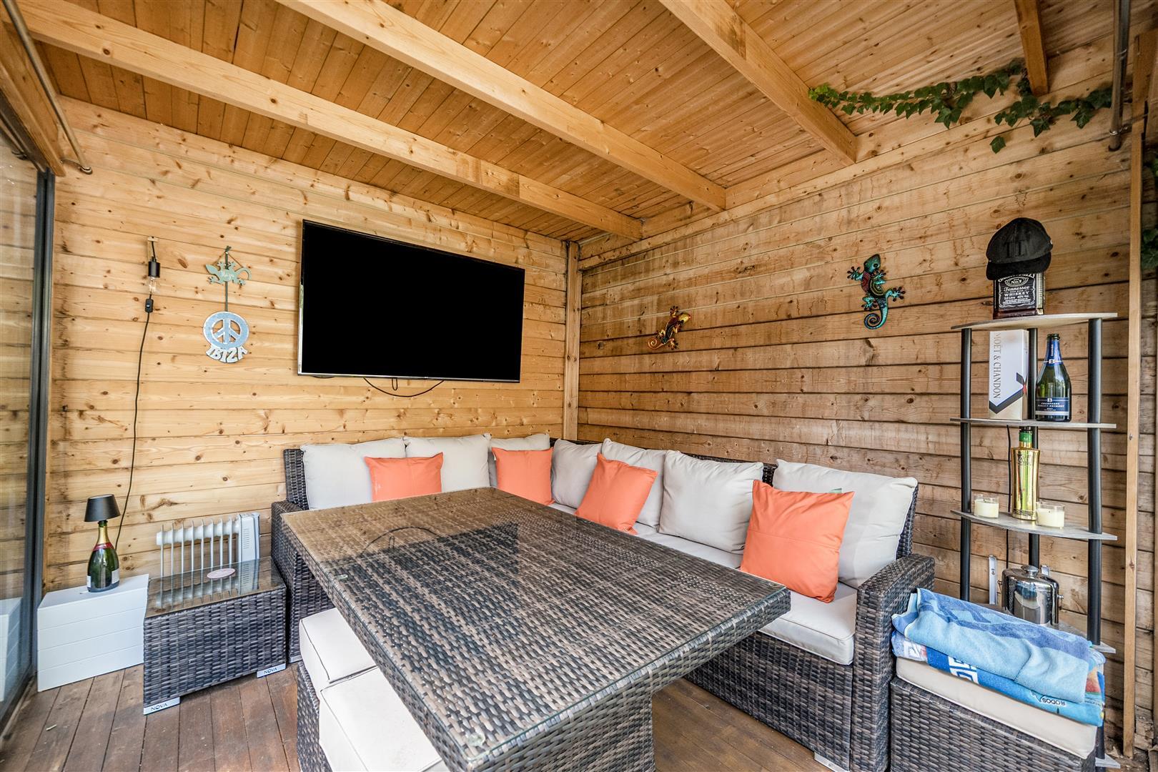 The landscaped rear garden is a real feature of this home, designed to be enjoyed throughout the year. It offers multiple decked seating areas, a fully fitted outdoor kitchen with barbecue facilities, a dedicated hot tub zone and a superb summer house with sliding doors, power and lighting, providing an inviting retreat or entertaining space.
