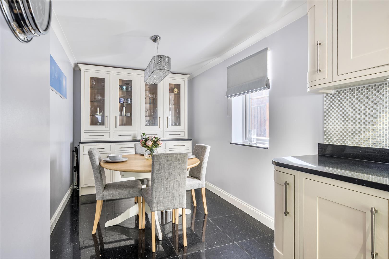 The welcoming entrance hall leads to a bright and spacious living room with patio doors opening directly onto the garden. A formal dining room provides an ideal space for entertaining, while the sleek kitchen has been fitted with a central island, integrated appliances and generous storage. A dining area within the kitchen is perfectly suited to family life. The ground floor also offers a home office and a cloakroom.