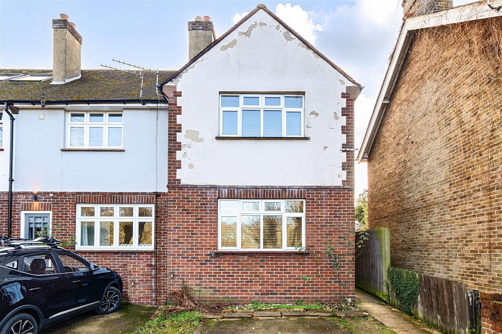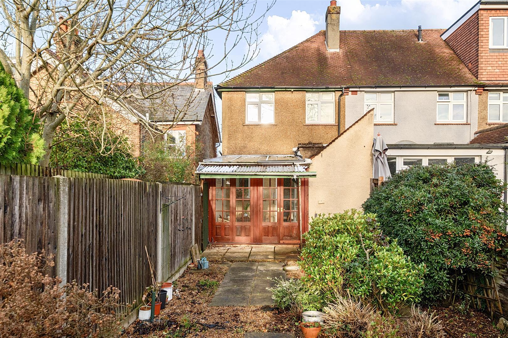 Upstairs, there are three well-proportioned bedrooms and a family bathroom. The long, south-facing rear garden is mainly laid to lawn and enhanced by mature trees and shrubs, with the benefit of side access.