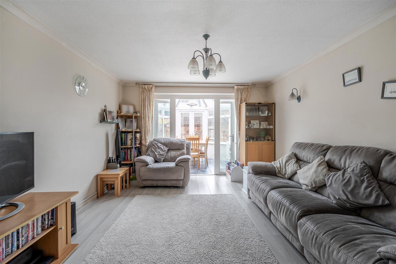 The front-aspect fitted kitchen is well equipped with a built-in oven and hob, fridge, and washing machine. To the rear, a spacious lounge flows seamlessly into a heated conservatory, complete with newly fitted blinds and currently used as a family dining room, with direct access to the garden.