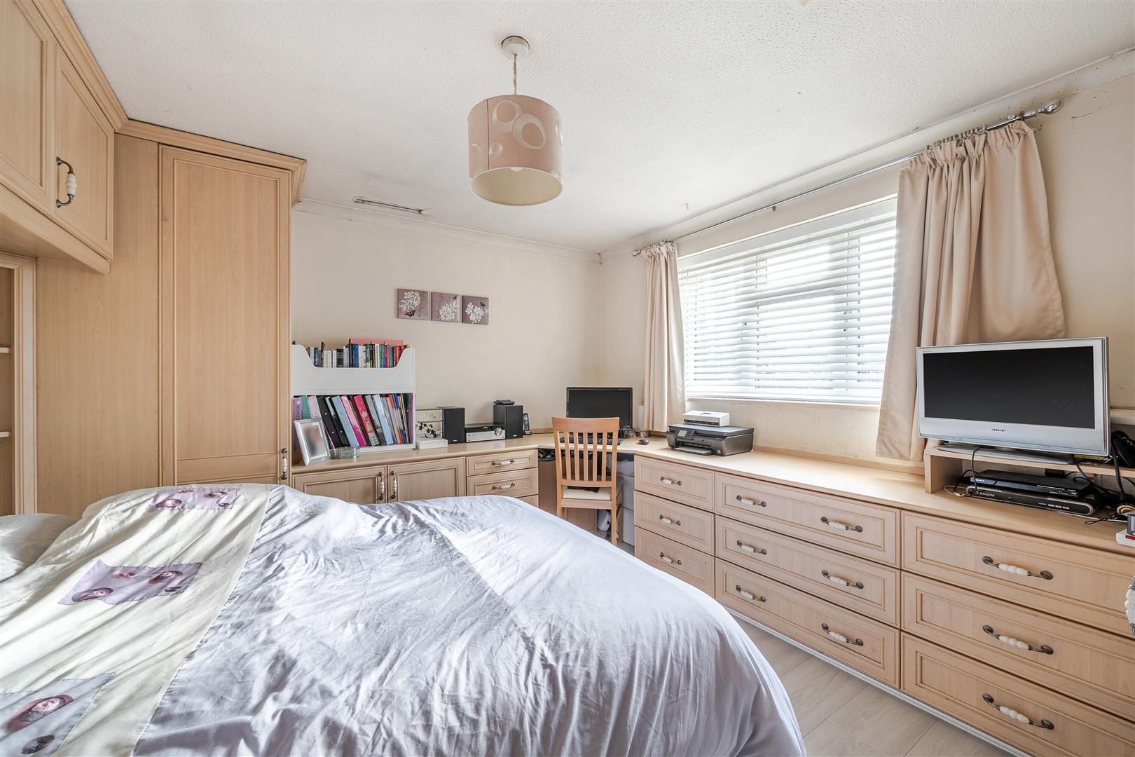 Upstairs, there are three good-sized bedrooms, including a principal bedroom with a range of fitted wardrobes, along with a family bathroom.