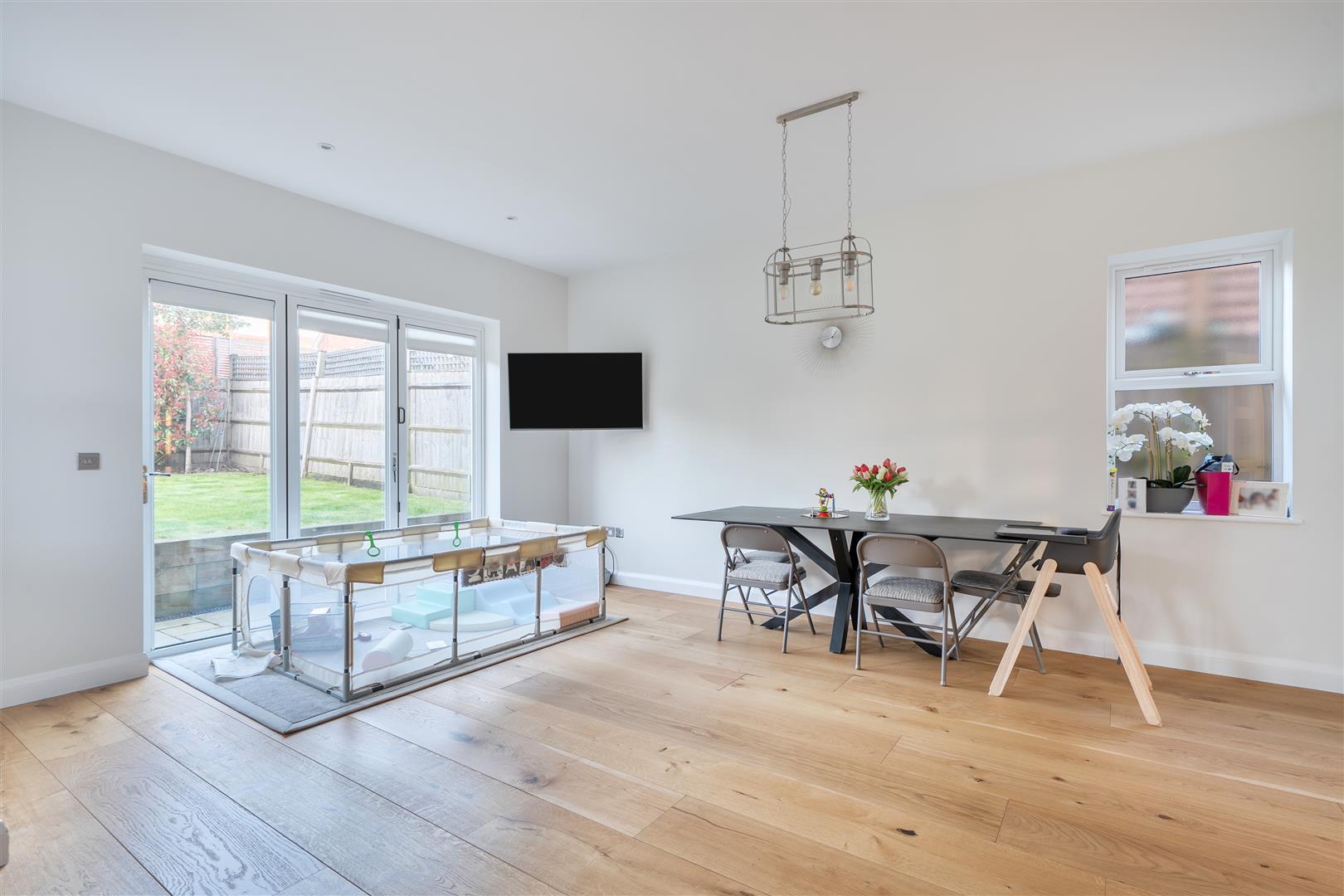 A spacious entrance hall leads through double doors into a bright and generous lounge. The stunning L-shaped kitchen/diner is the heart of the home with a central island, plenty of storage and integrated appliances. There are dual bi-fold doors opening onto a terrace with a raised vegetable bed and steps up to a level lawn—perfect for entertaining and family living.